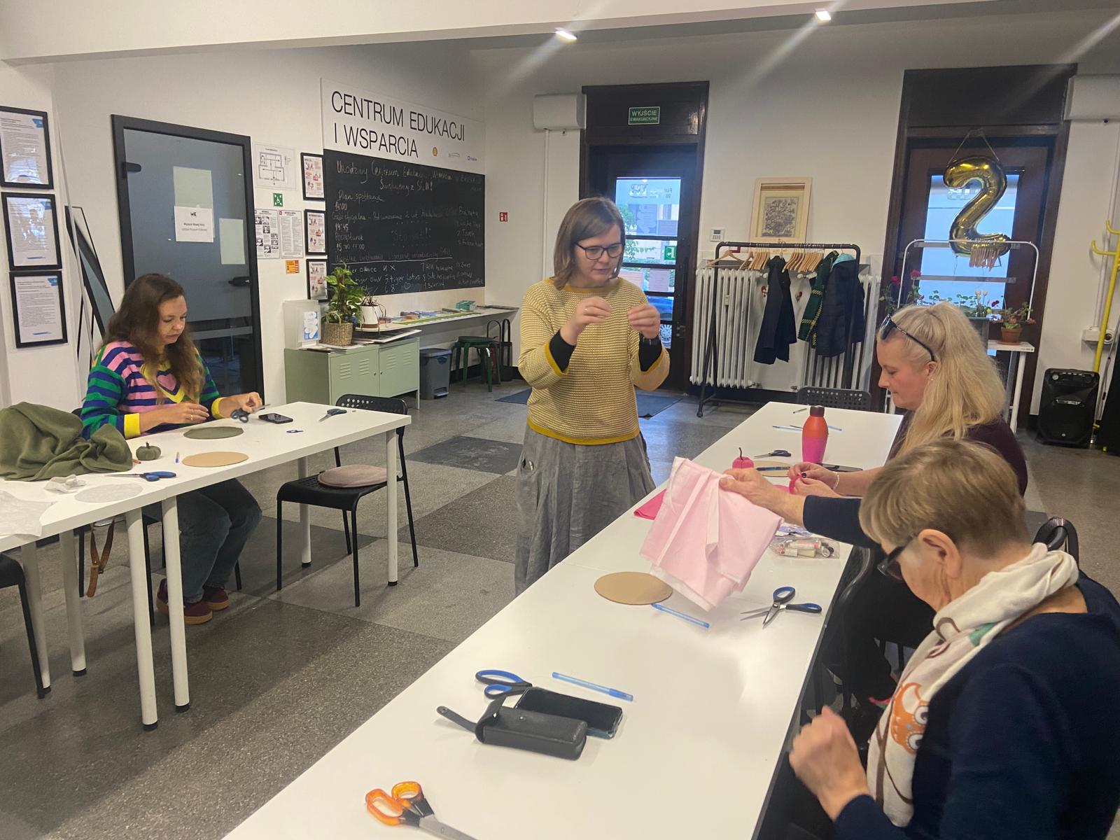 Aby uczcić nadejście jesieni, wybraliśmy temat idealnie wpisujący się w jesienny klimat — tworzyliśmy ozdobne dynie z materiałów z recyklingu. Powstały one z używanych tkanin, starych włóczek i nitek, a przede wszystkim z dużą dozą kreatywności. W warsztatach wzięli udział mieszkańcy okolicy, którzy chcieli nauczyć się, jak samodzielnie wykonać kolorowe, wesołe dynie do ozdoby swoich domów. Atmosfera była ciepła i radosna. Uczestnicy dzielili się opowieściami, doświadczeniami i dobrym humorem.