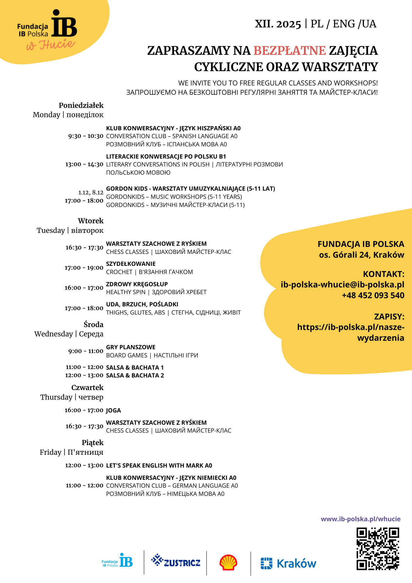 Zapraszamy wszystkich mieszkańców Nowej Huty i okolic do udziału w zajęciach i warsztatach grudniowych w IB Polska w Hucie!