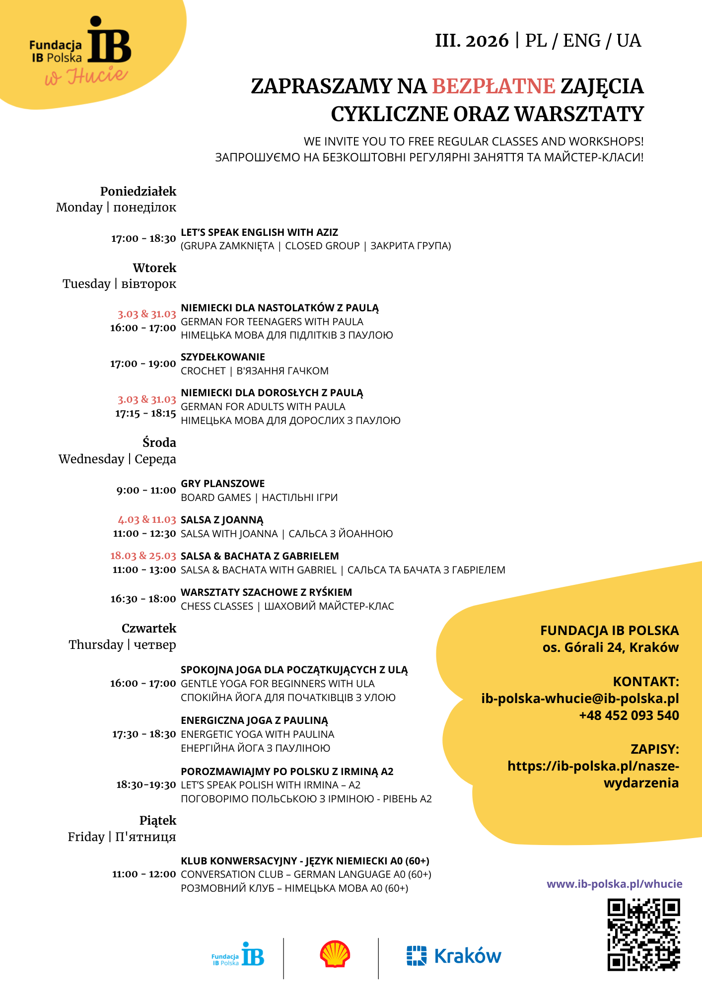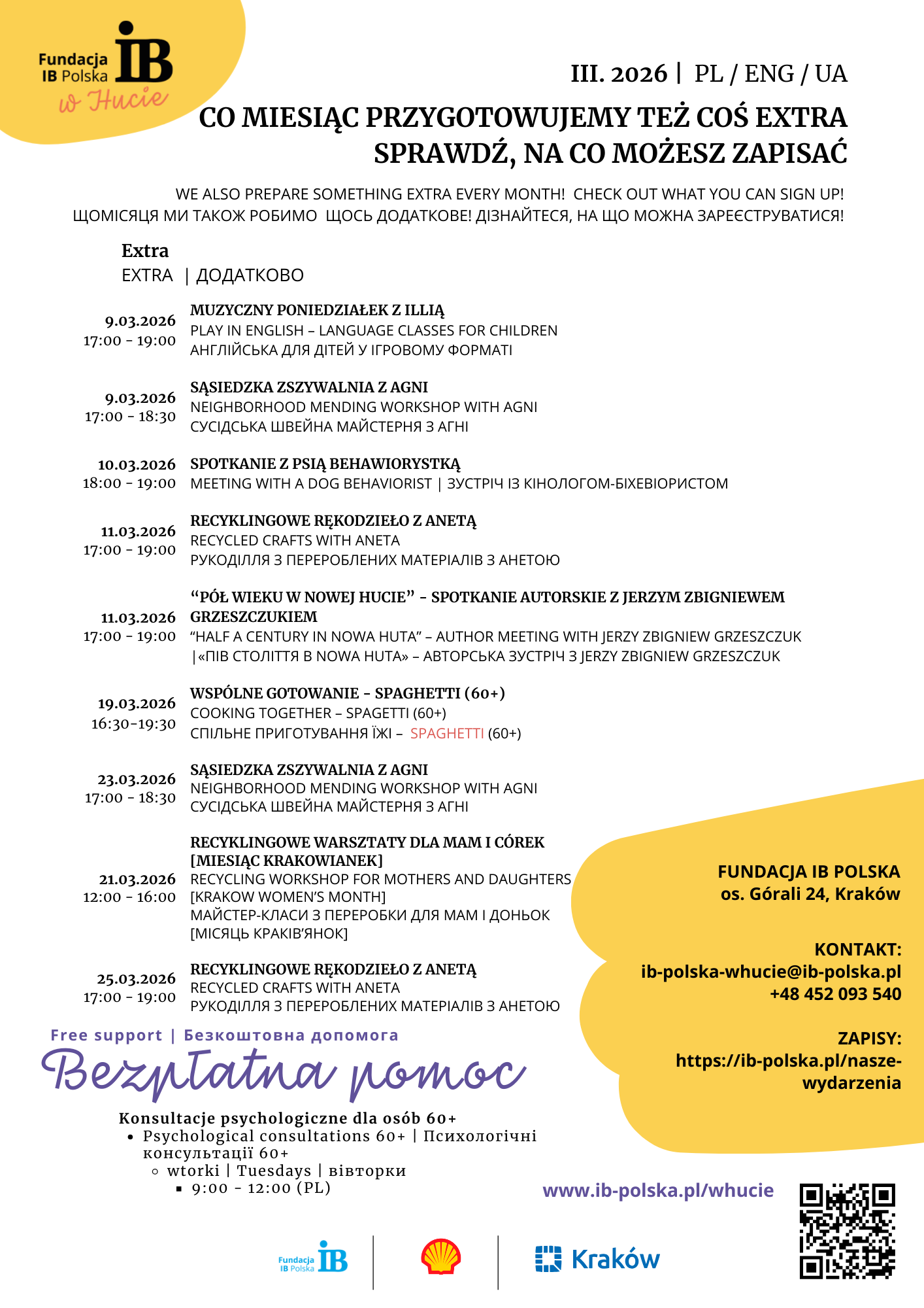 Harmonogram bezpłatnych zajęć na marzec w IB Polska w Hucie