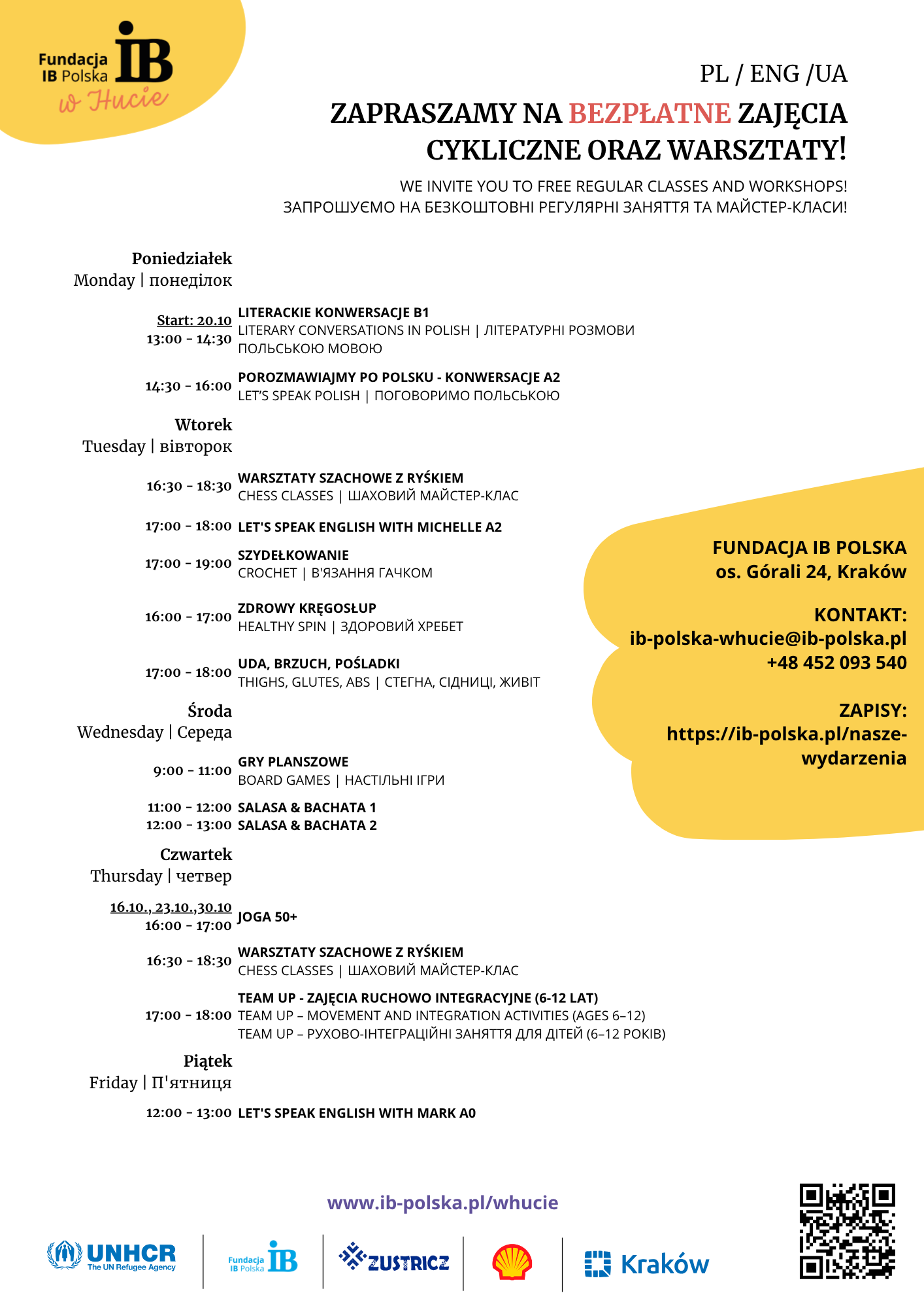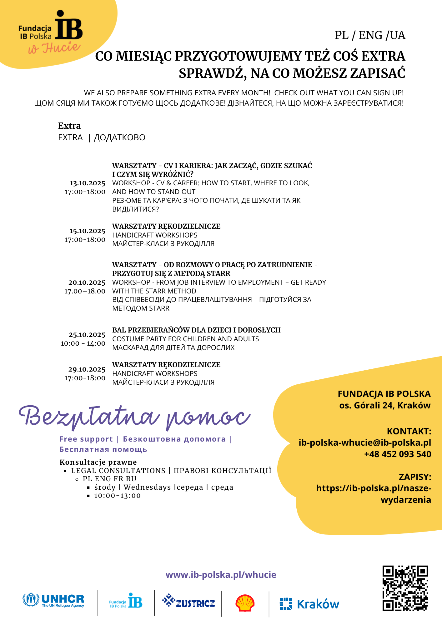 Co ciekawego w październiku w IB Polska w Hucie? Czekają na Was zajęcia cykliczne takie jak joga, salsa & bachata, warsztaty szachowe, konwersacje językowe, szydełkowanie i gry planszowe. Mamy też dla was wydarzenia specjalne, m.in. bal przebierańców czy warsztaty rozwojowe i rękodzielnicze. Sprawdź, co przygotowaliśmy i dołącz do nas na os. Górali 24!