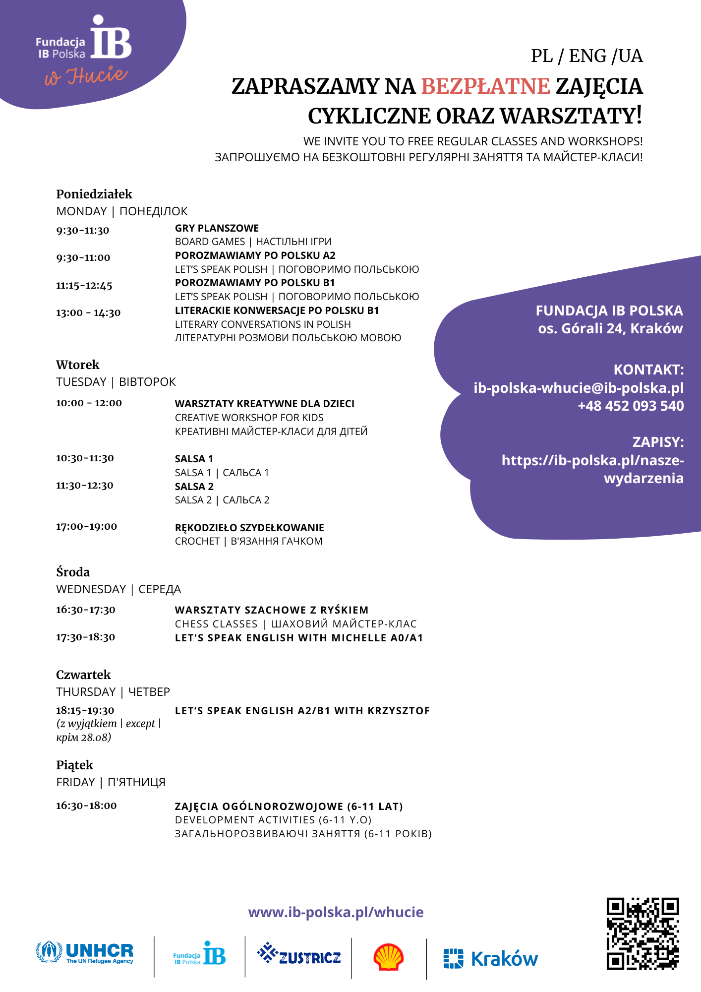 Dołącz do nas w Nowej Hucie na warsztaty, spotkania językowe, szachy, konsultacje i letnie wydarzenia w ogrodzie! Wszystkie zajęcia są bezpłatne i otwarte dla każdego – sprawdź harmonogram i bądź z nami!
