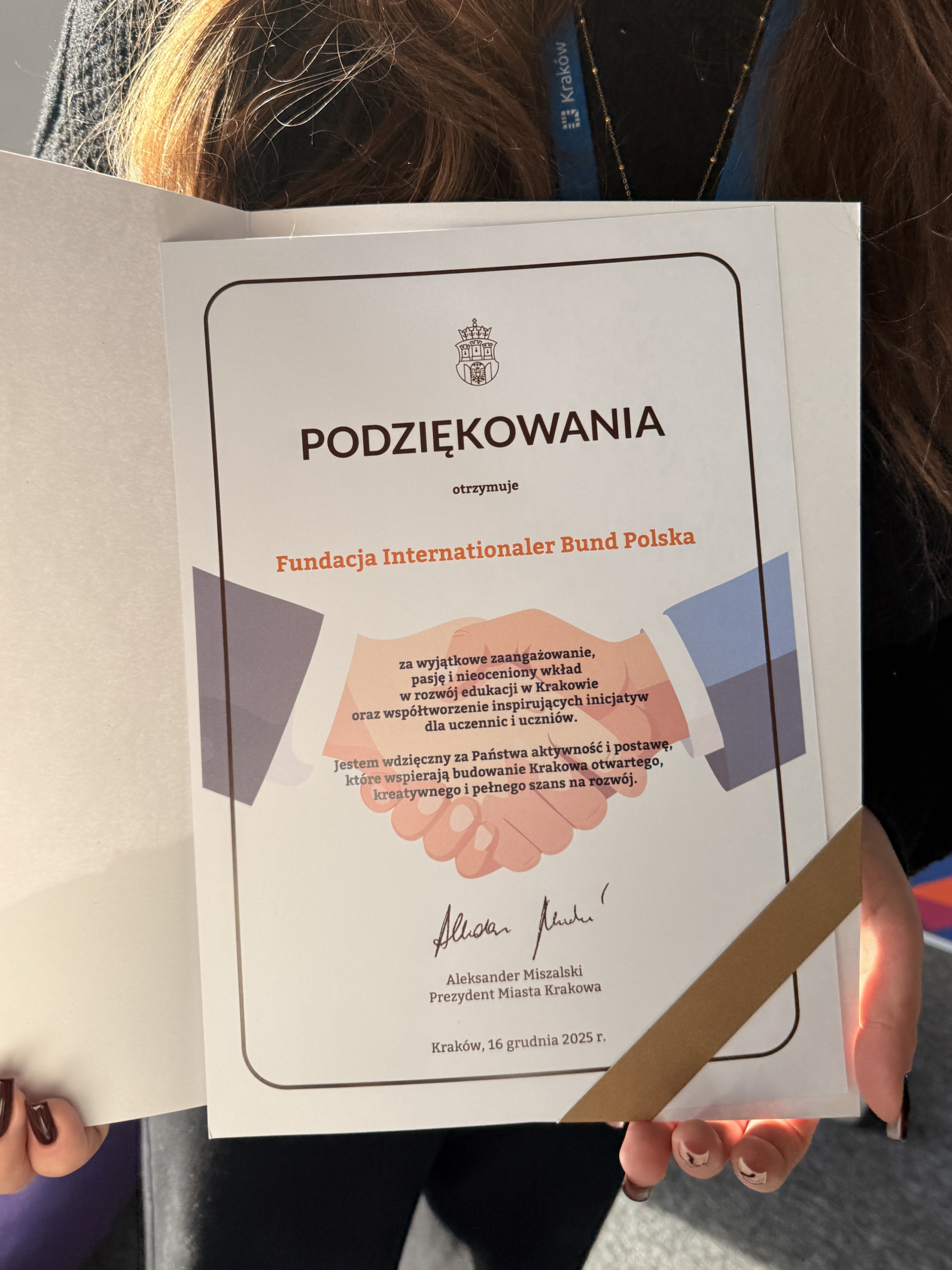 Z dumą i wdzięcznością informujemy, że nasza Fundacja IB Polska otrzymała specjalne podziękowania za wkład w rozwój krakowskiej edukacji od prezydenta Miasta Krakowa. To dla nas ważne wyróżnienie i potwierdzenie, że działania podejmowane na rzecz edukacji, uczniów, nauczycieli i środowisk lokalnych są dostrzegane i doceniane.