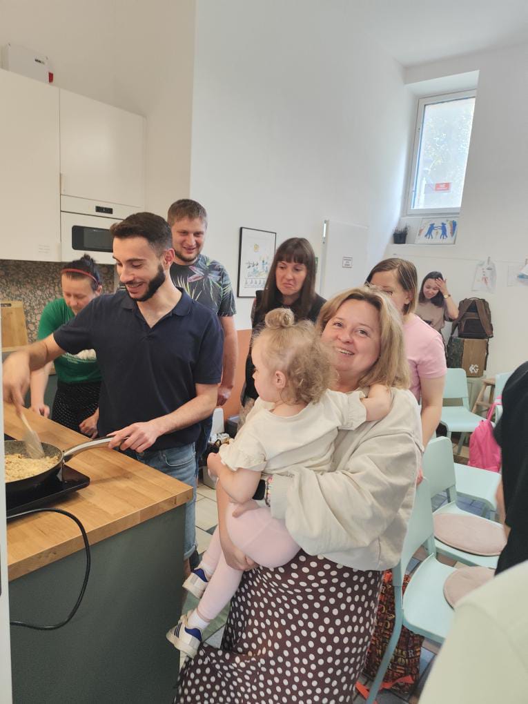 W przerwie nie zabrakło ruchu – uczestnicy próbowali swoich sił w tańcu bałkańskim w naszej sali sportowej, co wywołało mnóstwo radości i śmiechu. Wspólne gotowanie zakończyło się degustacją pysznego, własnoręcznie przygotowanego deseru.