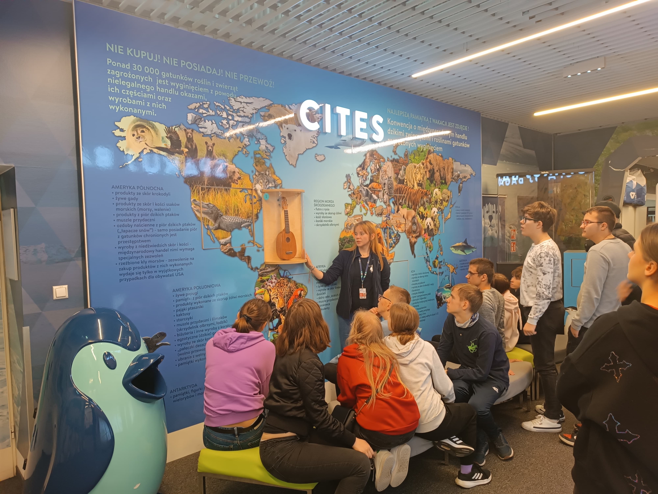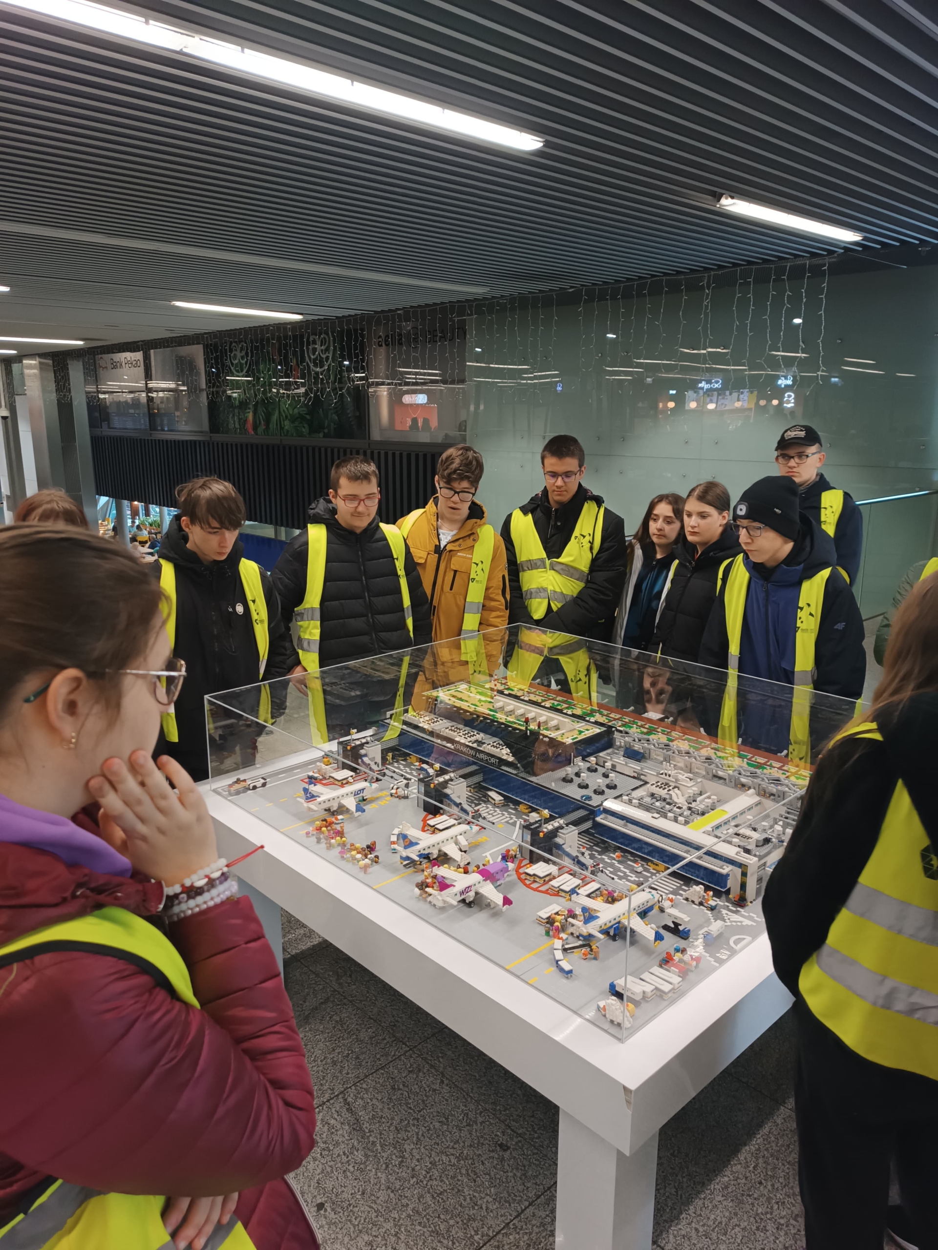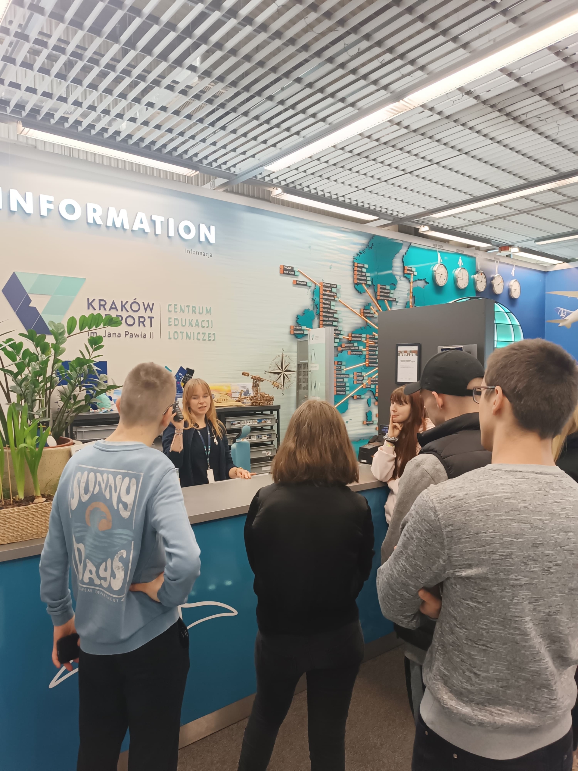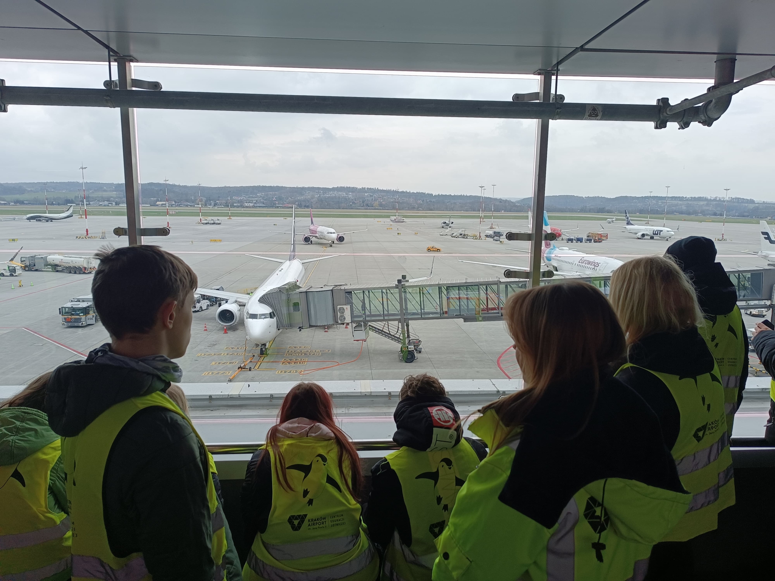 Na miejscu czekała na nas przewodniczka z Centrum Edukacji Lotniczej i specjalny program zwiedzania, który pomógł uczniom oswoić się z tematem podróży samolotem. Odwiedziliśmy taras widokowy, z którego mogliśmy obserwować ruch na lotnisku, w tym starty i lądowania samolotów. Widok był imponujący i z pewnością rozbudził podróżnicze emocje przed zbliżającym się wyjazdem!