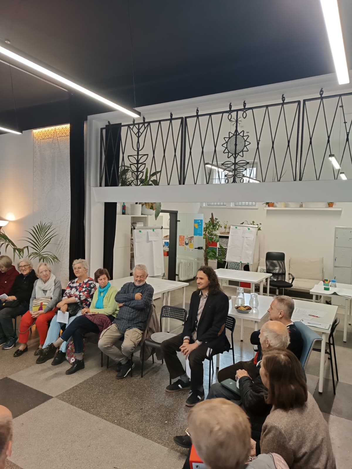 Na początku nasz koordynator Illia oraz Grzegorz, zastępca dyrektora fundacji, przedstawili krótko program spotkania oraz wstępne założenia dotyczące funkcjonowania Centrum Aktywności Seniora. Choć od lat działamy na rzecz seniorów i współpracujemy z krakowskimi CAS-ami to po raz pierwszy na zlecenie miasta będziemy prowadzić takie Centrum.