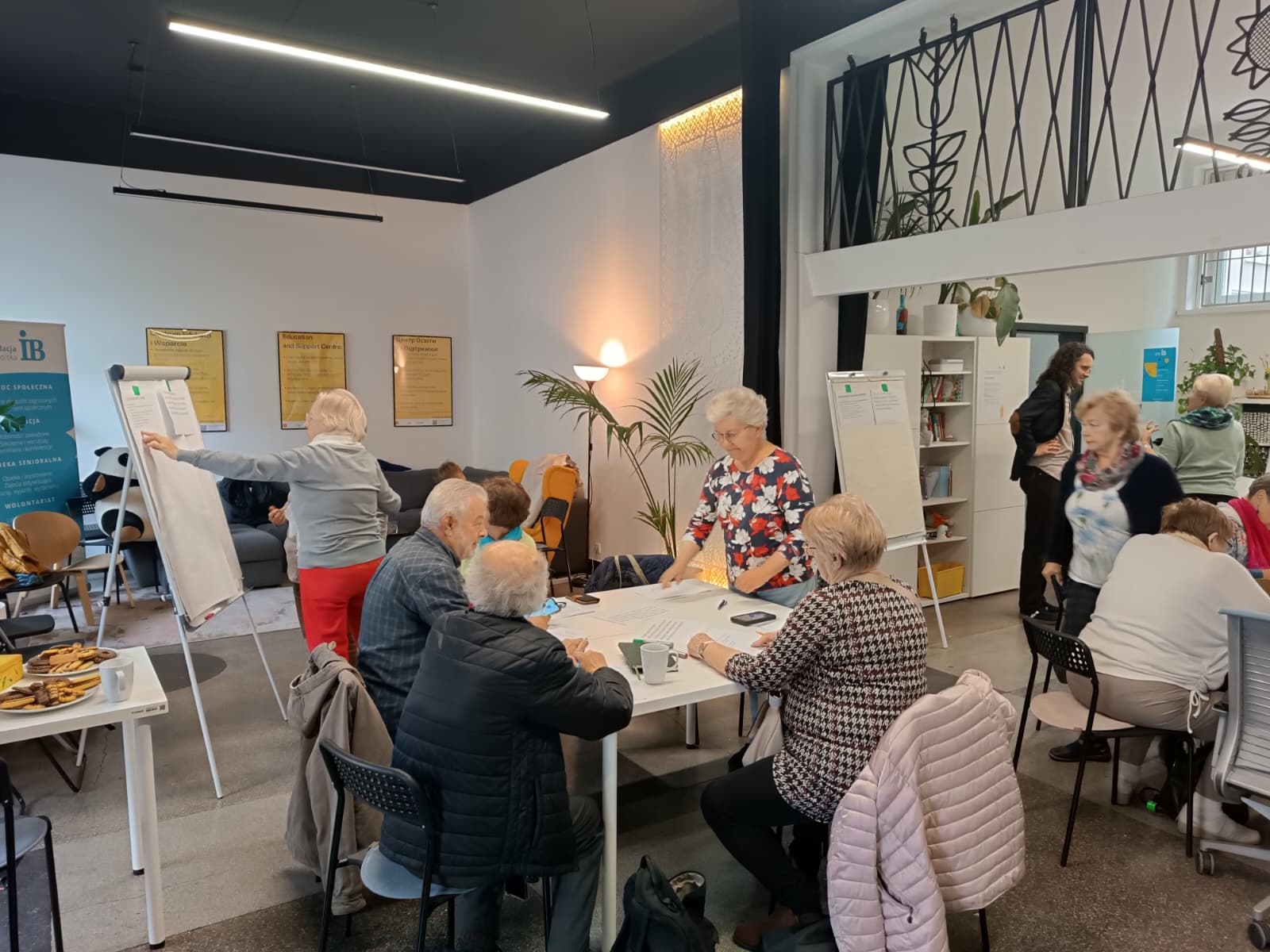 Kolejnym punktem programu był warsztat poprowadzony metodą world cafe. Grono ponad 20 seniorów aktywnie dzieliło się z nami swoimi pomysłami, doświadczeniami i potrzebami. Uczestnicy pokazali jak bardzo zależy im na tym miejscu i jak chcą je współtworzyć razem z nami. Atmosfera była pełna zaangażowania i rozmów o tym, co możemy wspólnie zrobić dla naszej lokalnej społeczności.