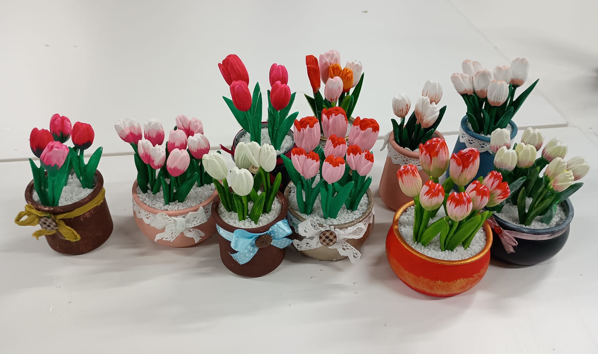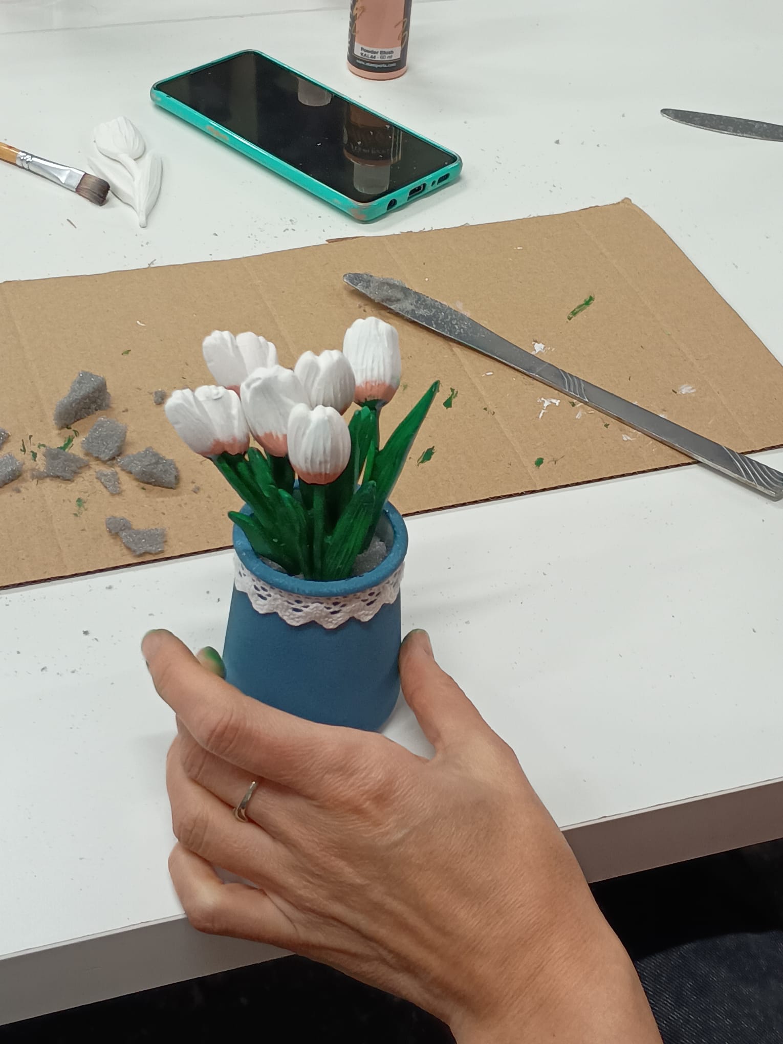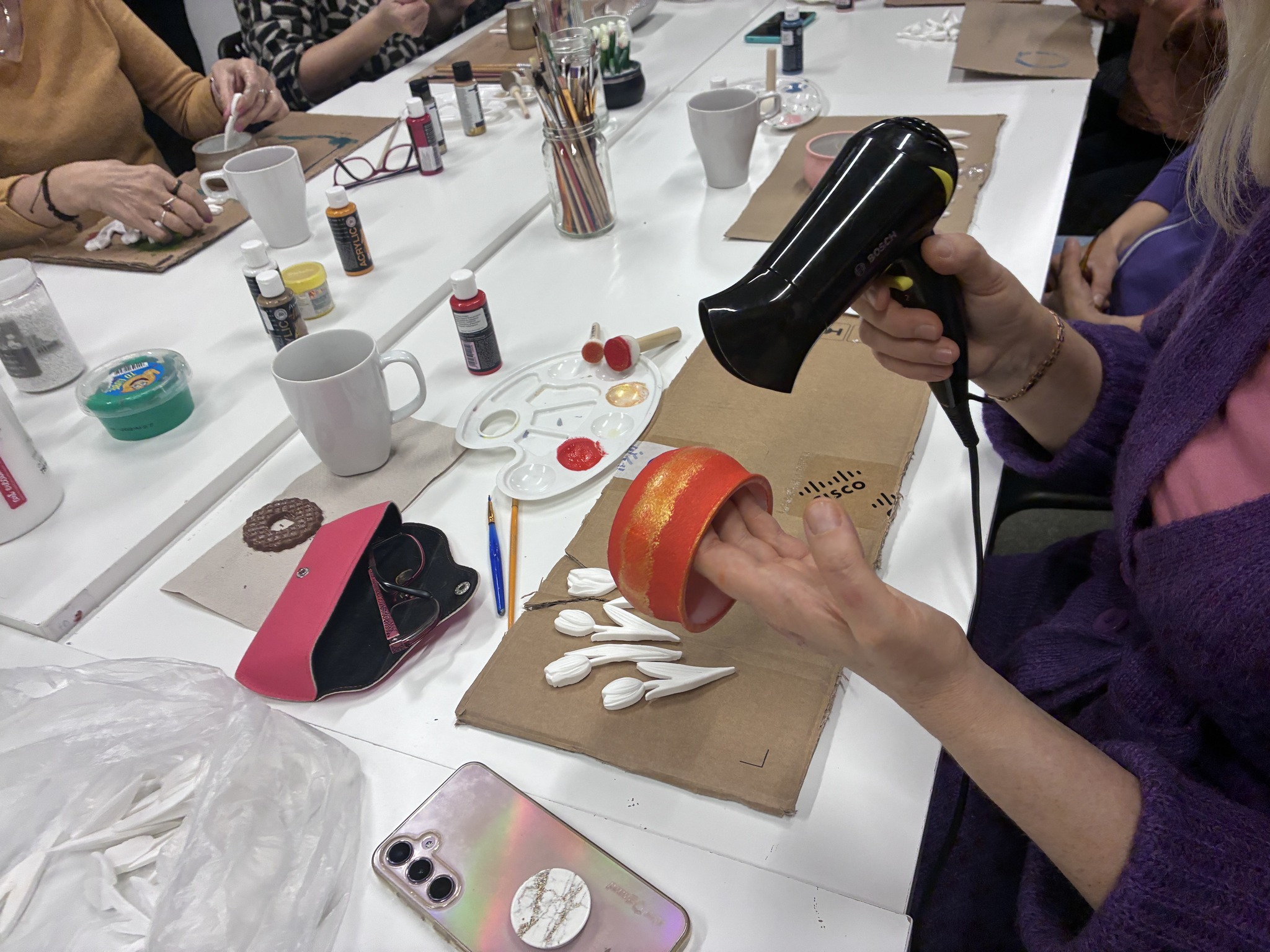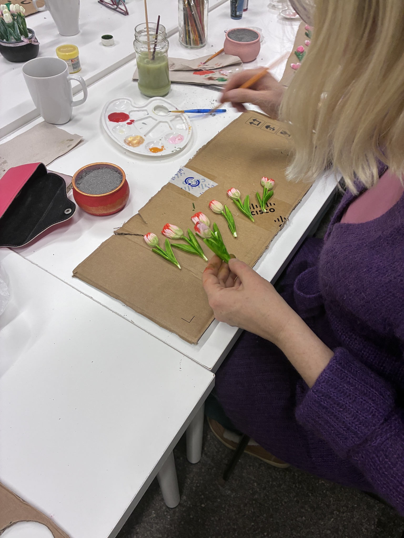 Po pomalowaniu słoików przyszedł czas na wybór tulipanów: ile ich będzie, jak je ułożyć i – co okazało się najtrudniejsze – jak je pomalować. Po wymianie pomysłów zabraliśmy się do pracy, ożywiając kwiaty. Każda uczestniczka dodała coś od siebie, tworząc unikalne kompozycje kolorystyczne i style. W trakcie pracy rozmawiałyśmy o warsztatach i efektach naszych działań.