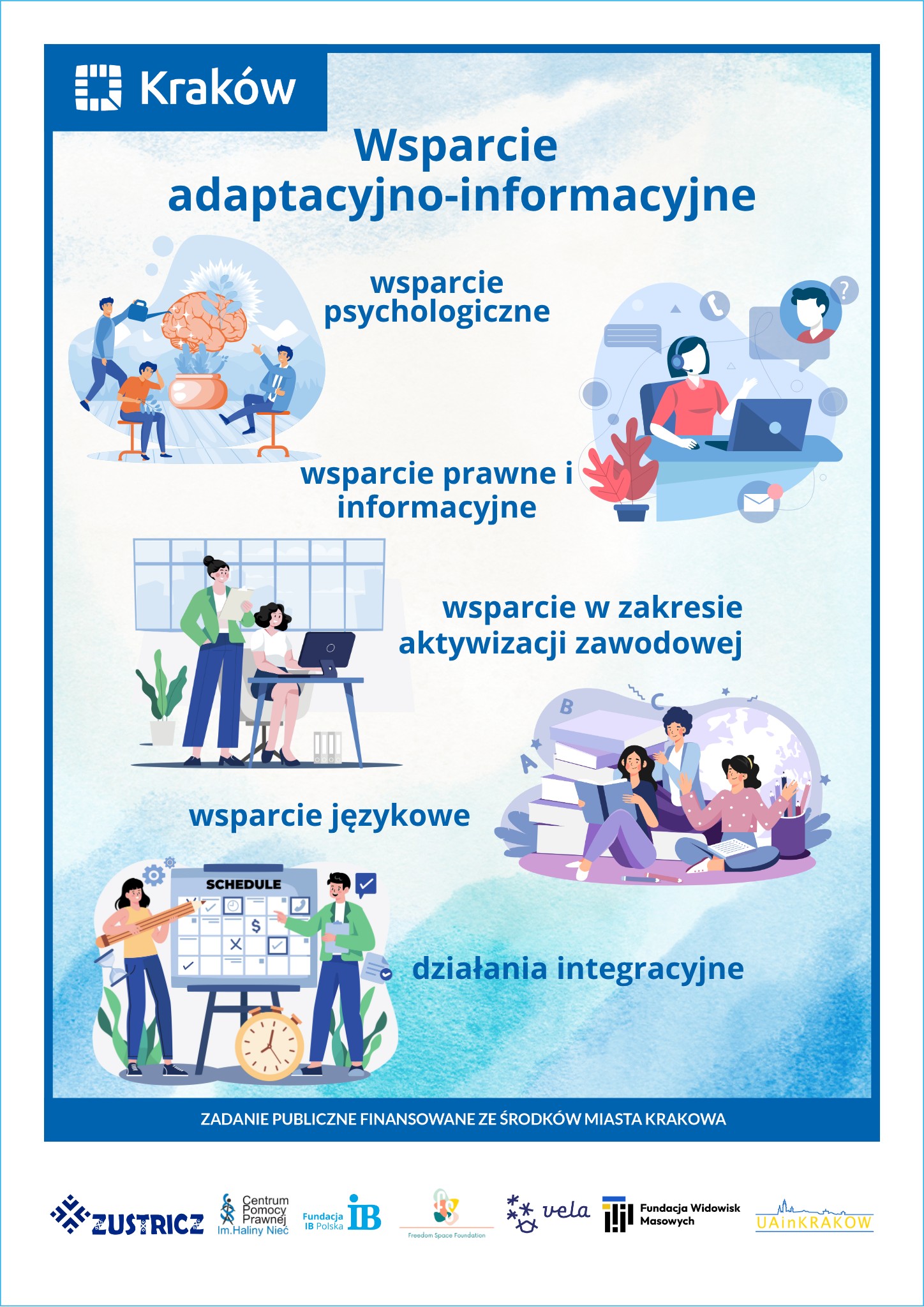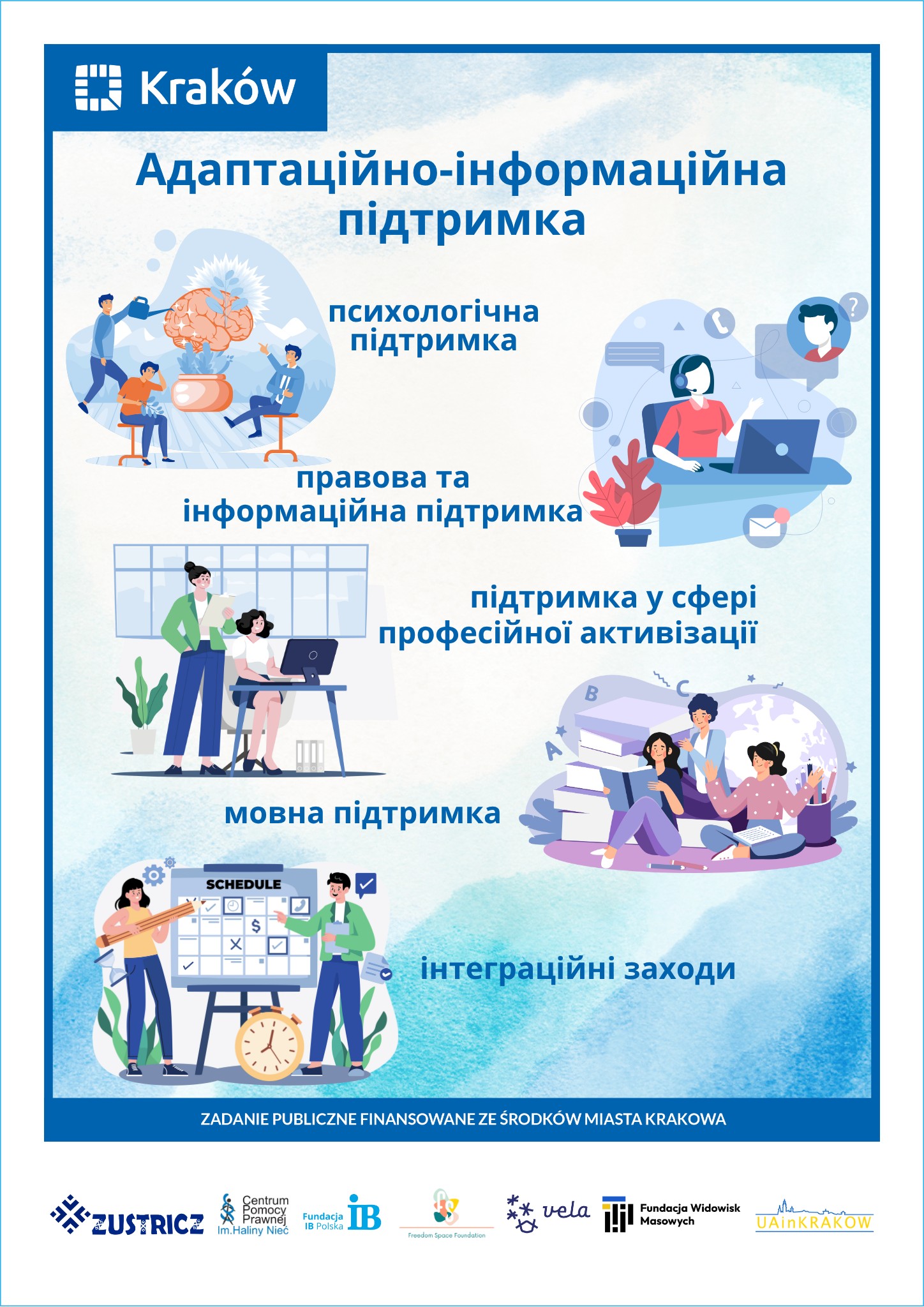 Projekt zakłada prowadzenie stałego wsparcia psychologicznego indywidualnego i grupowego w kilku językach, w tym ukraińskim i rosyjskim, dostosowanego do potrzeb różnych grup wiekowych, w tym seniorów. Ważnym elementem jest zapewnienie wsparcia informacyjnego i asystenckiego pomagającego w sprawach urzędowych, edukacyjnych, zdrowotnych i społecznych. Fundacja realizuje także działania integracyjne, w tym wydarzenia kulturalne, sportowe i rekreacyjne, sprzyjające dialogowi międzykulturowemu oraz przeciwdziałaniu wykluczeniu i dyskryminacji. Wszystkie działania są realizowane z uwzględnieniem wielokulturowości, dostępności językowej oraz specyfiki potrzeb osób migracyjnych i uchodźczych.