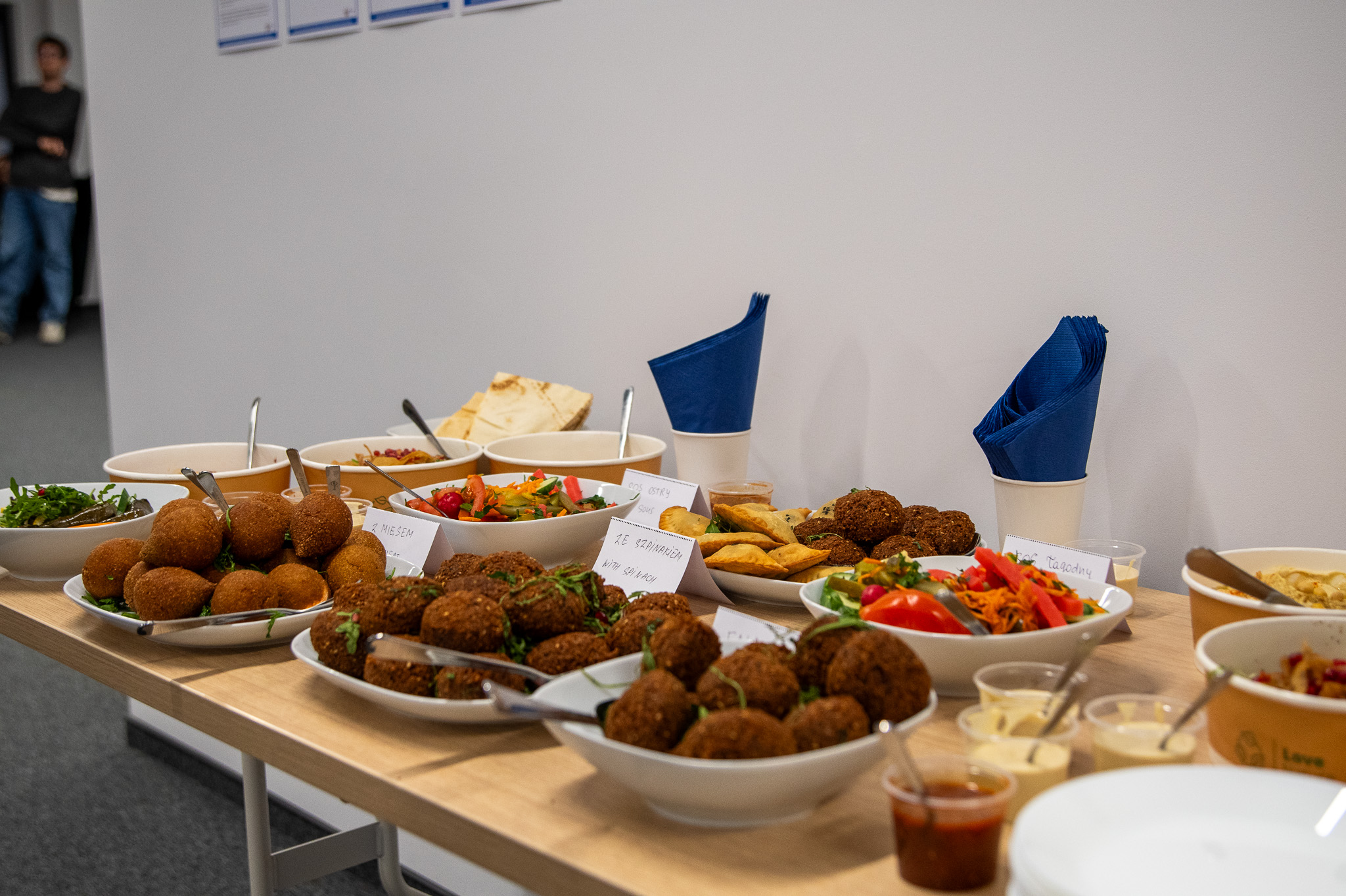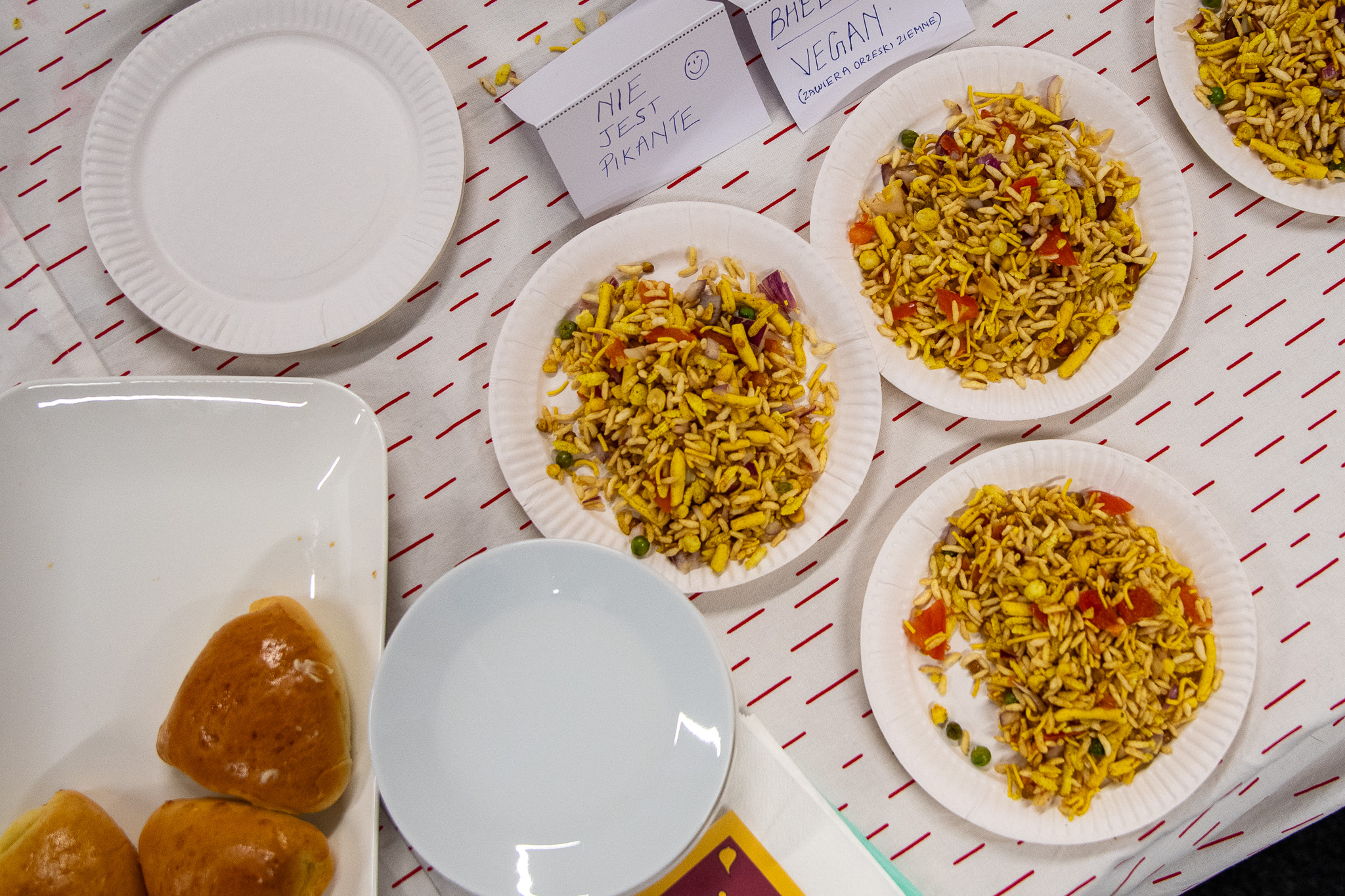 Wspólne odkrywanie wielokulturowości Krakowa rozpoczęło się od międzynarodowego poczęstunku, który odzwierciedlał różnorodność kulturową mieszkańców naszego miasta. Tradycyjny polski barszcz czerwony i pierogi z kapustą i grzybami dzieliły miejsce z tureckimi słodkościami Tanera – właściciela kawiarni w centrum Krakowa, który wcześniej gościł uczestników podczas tureckiego śniadania. Nie zabrakło także syryjskich, indyjskich i lankijskich specjałów, starannie przygotowanych przez przyjaciół Fundacji, którzy chcieli odwdzięczyć się za pomoc oraz przedstawić swoją kulturę wszystkim mieszkańcom Krakowa. Z kolej wolontariusze Europejskiego Korpusu Solidarności, którzy przyjeżdżają na wymianę do Fundacji od środy przygotowywali potraw charakterystycznych dla swoich krajów. Tak różnorodne menu nie tylko zachwycało smakiem, ale również budowało mosty międzykulturowe, otwierające wszystkich zebranych na nowe doświadczeniai rozmowy! Aromatyczne dania przygotowane przez beneficjentów i wolontariuszy były prawdziwą podróżą kulinarną! A samo jedzenie z różnych kultur od lat łączy ludzi wokół Centrum Wielokulturowego.