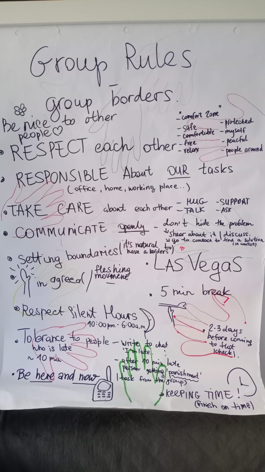 After that, our facilitator asked each one of us about our feelings and experiences and took notes of the most important words. With them, we created the group rules that we need to follow in order to have a good group cohesion.