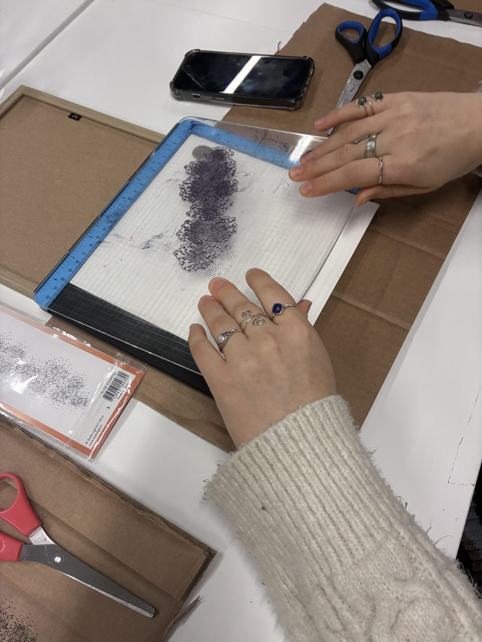 The workshop began with the creation of small decorative details using stamp-like tools, which delicately formed subtle patterns in the background of each frame. After that, we painted the background in soft, understated colors so the paper flowers would truly stand out. All the painting was done using watercolors and special watercolor paper, allowing us to work comfortably and achieve the best results.