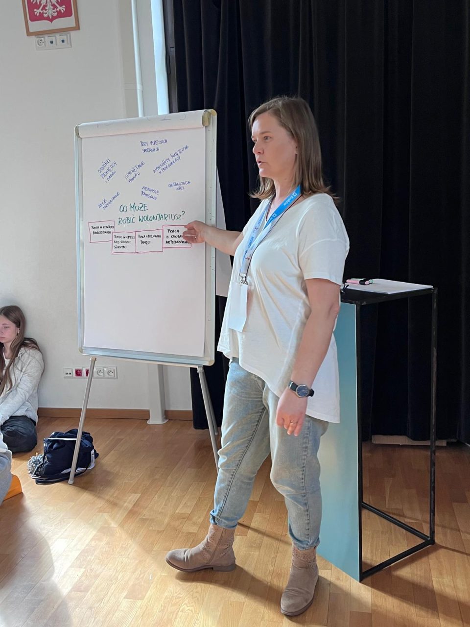In the workshop hosted by Aneta, with help from Paula, a group of 30 teenagers had the chance to discuss the advantages of volunteering—for themselves and for others. Furthermore, the kids shared their idea of the perfect volunteer by drawing them. They all actively participated in the workshop, which helped them reflect and think about their own future. Afterwards, Aneta showed them the different kinds of volunteer work, giving them valuable insight.