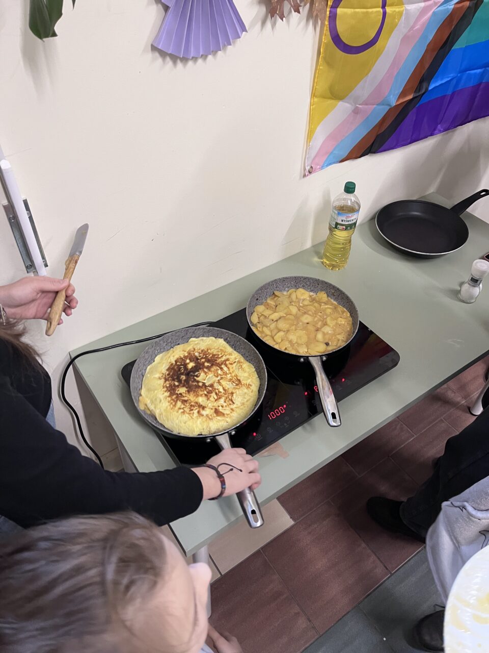 We got straight to work: first peeling and slicing the potatoes, then preparing the onions, and finally starting the cooking process. While making the tortillas, we shared cooking tips, personal tricks, and even some traditional Polish recipes. It was a lovely moment of cultural exchange, discovering similarities and differences between Spanish and Polish traditions.