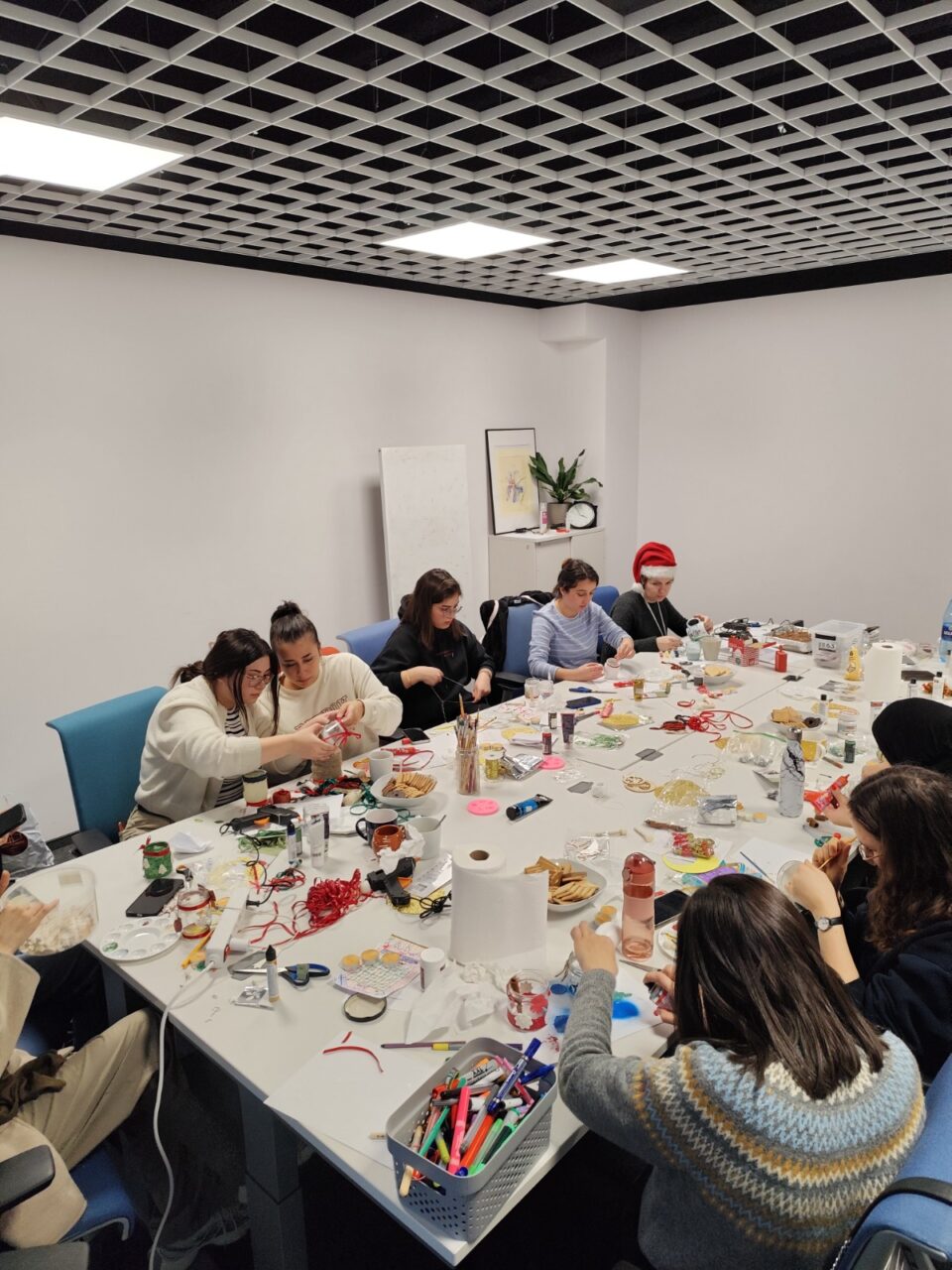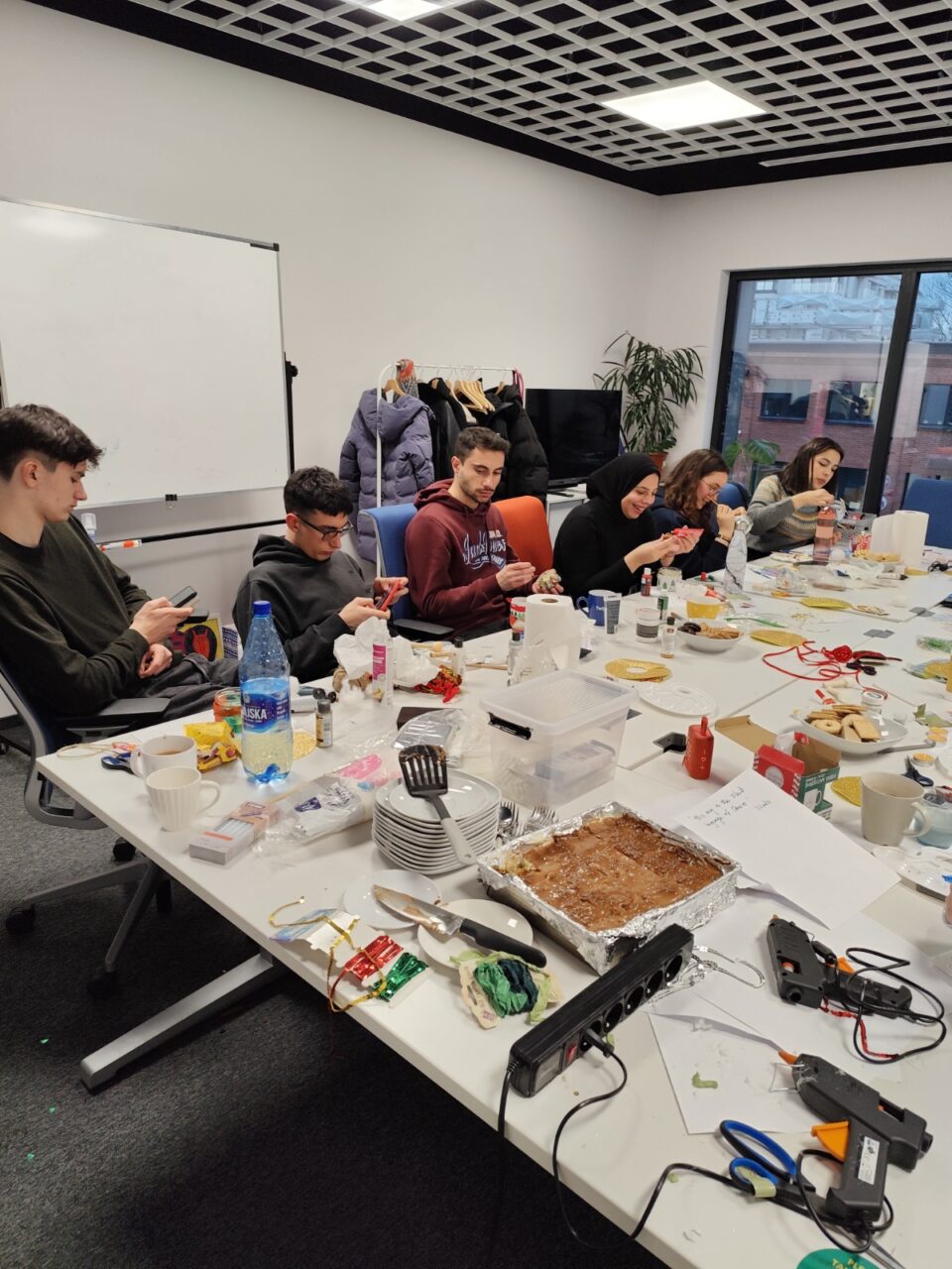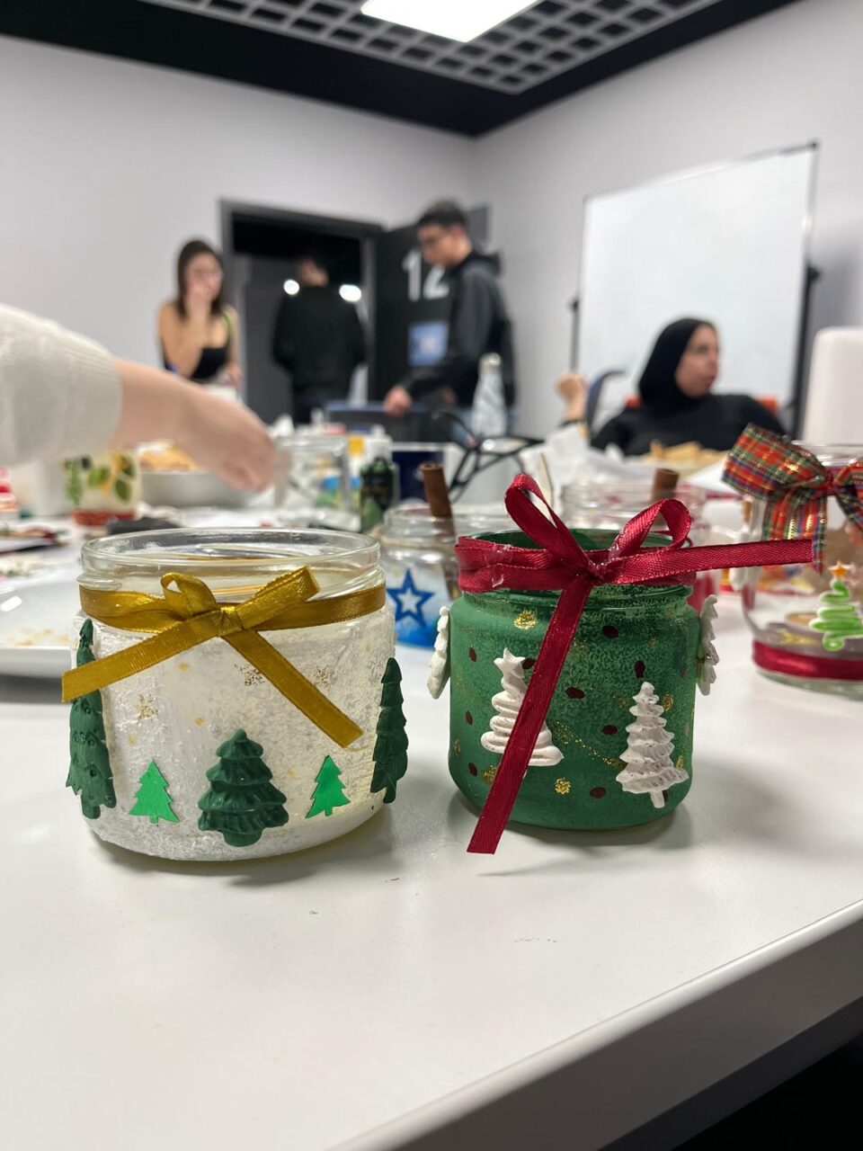 Afterwards, we continued with a creative activity: making lanterns out of jars. We had lots of materials such as paints, decorations, glitter, and stencils, so that each lantern was very individual. The atmosphere was relaxed and cheerful. There was lots of chatting, we enjoyed cake, Christmas music played in the background, and the air was full of excitement for the holiday season. After a brief photo session to showcase our lanterns, the meeting came to an end.
