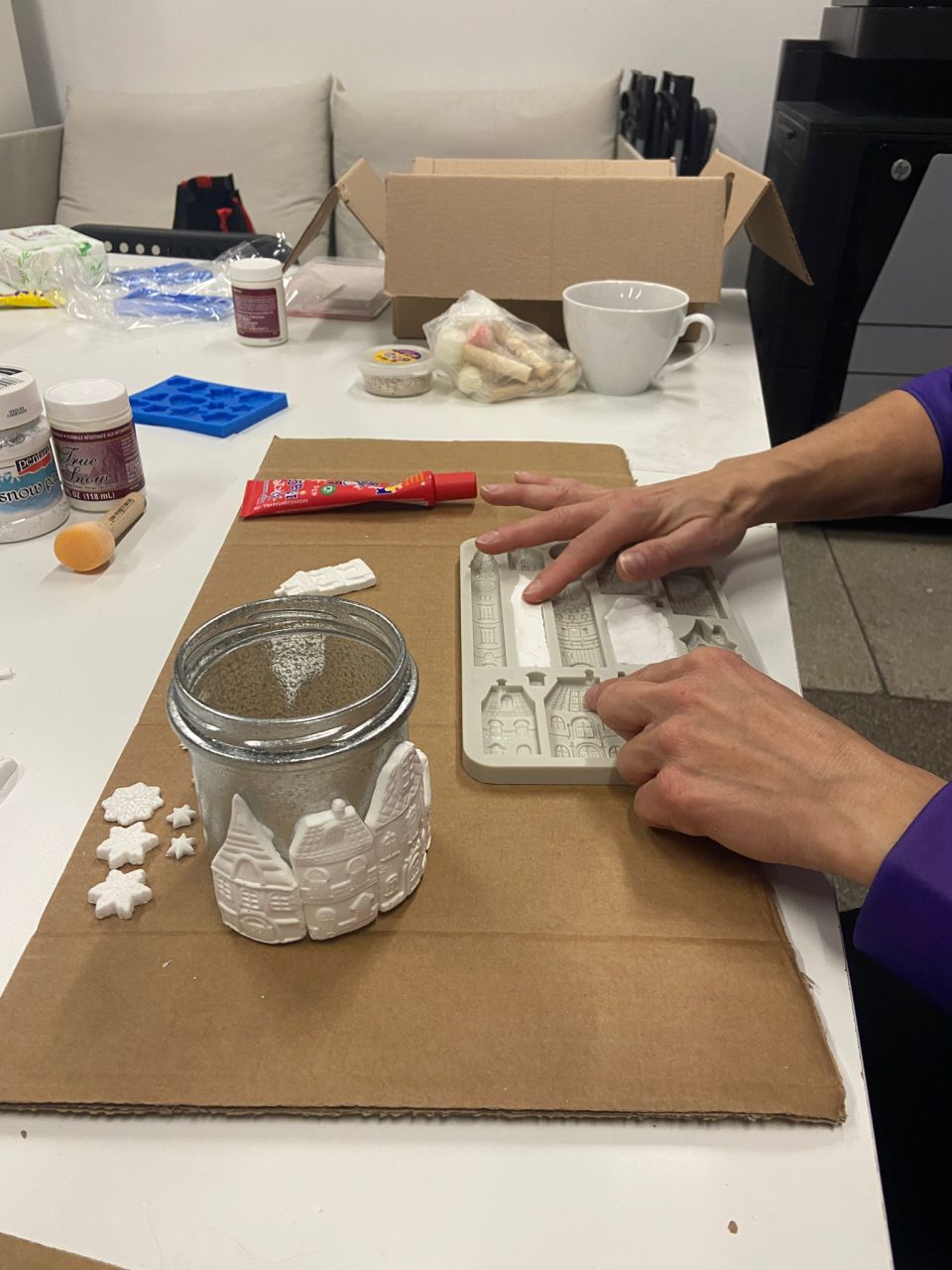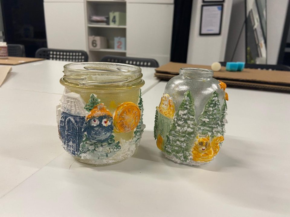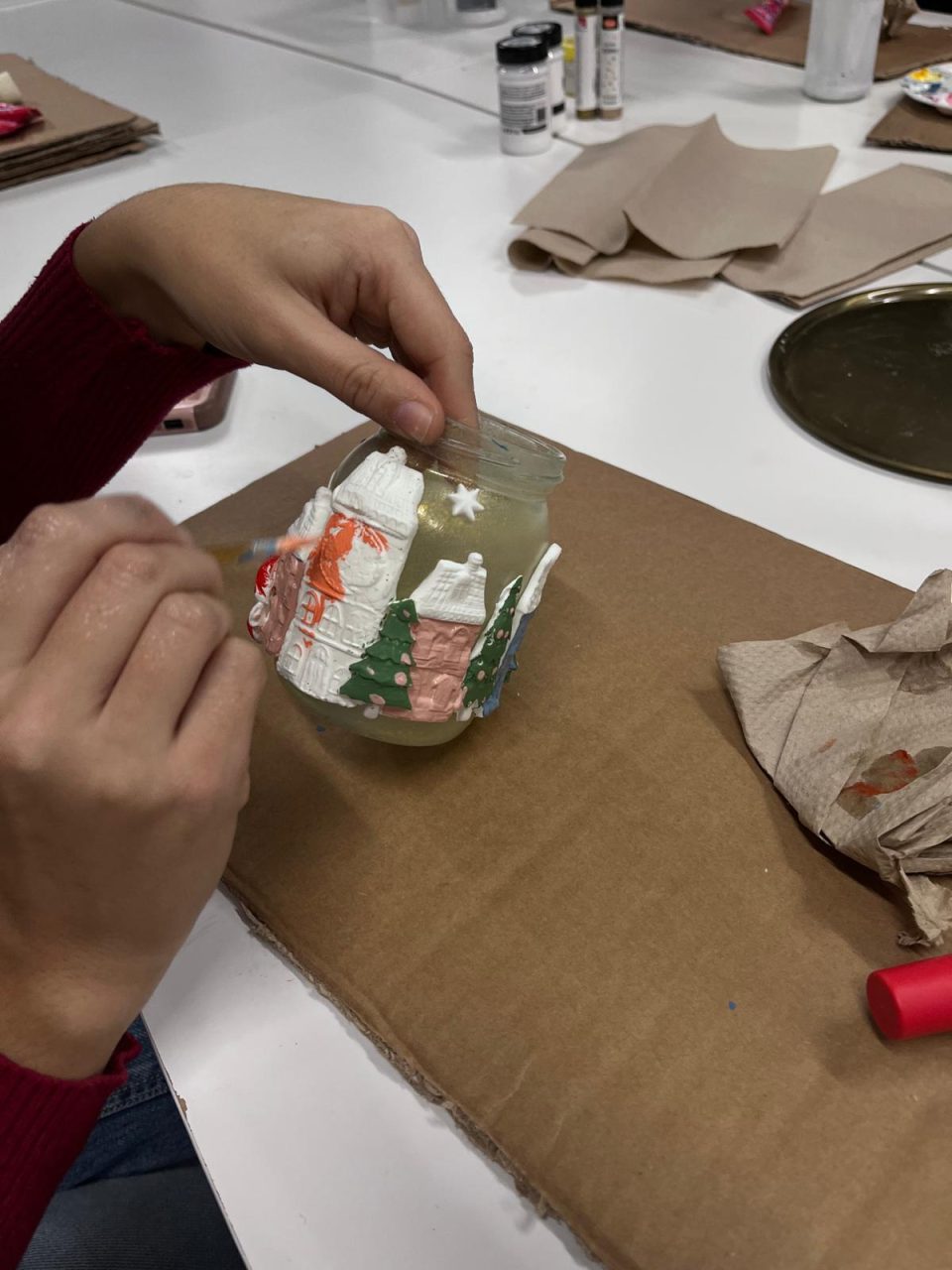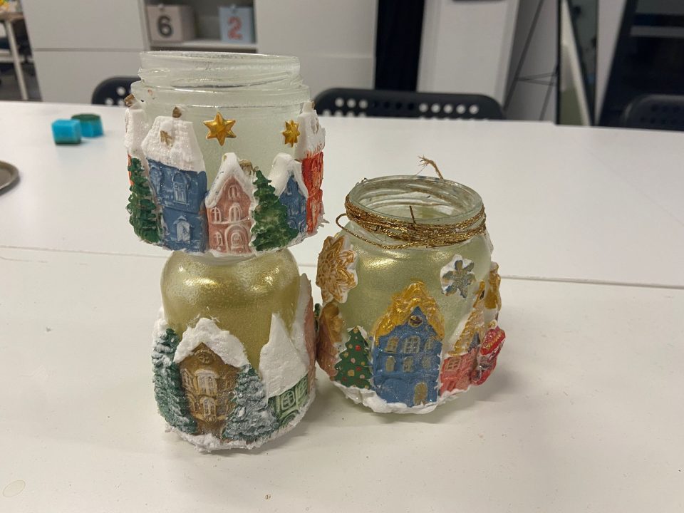 While the jars were drying, we made decorative elements using a special type of modeling paste. We crafted houses, buildings, Christmas trees, and even animals, which we later attached to the jar to create a charming Christmas village. We then painted the decorations in vibrant colors to give a personal and festive touch to our handmade candle holder.